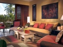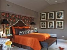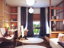 - Pour le sens du minimalisme et des concepts orientaux, la combinaison du brun avec les tons jaune et orange sera idéale. Les motifs en terre cuite qui ne crient pas auront l'air idéal non seulement dans un éclairage normal, mais également dans un éclairage de couleur.