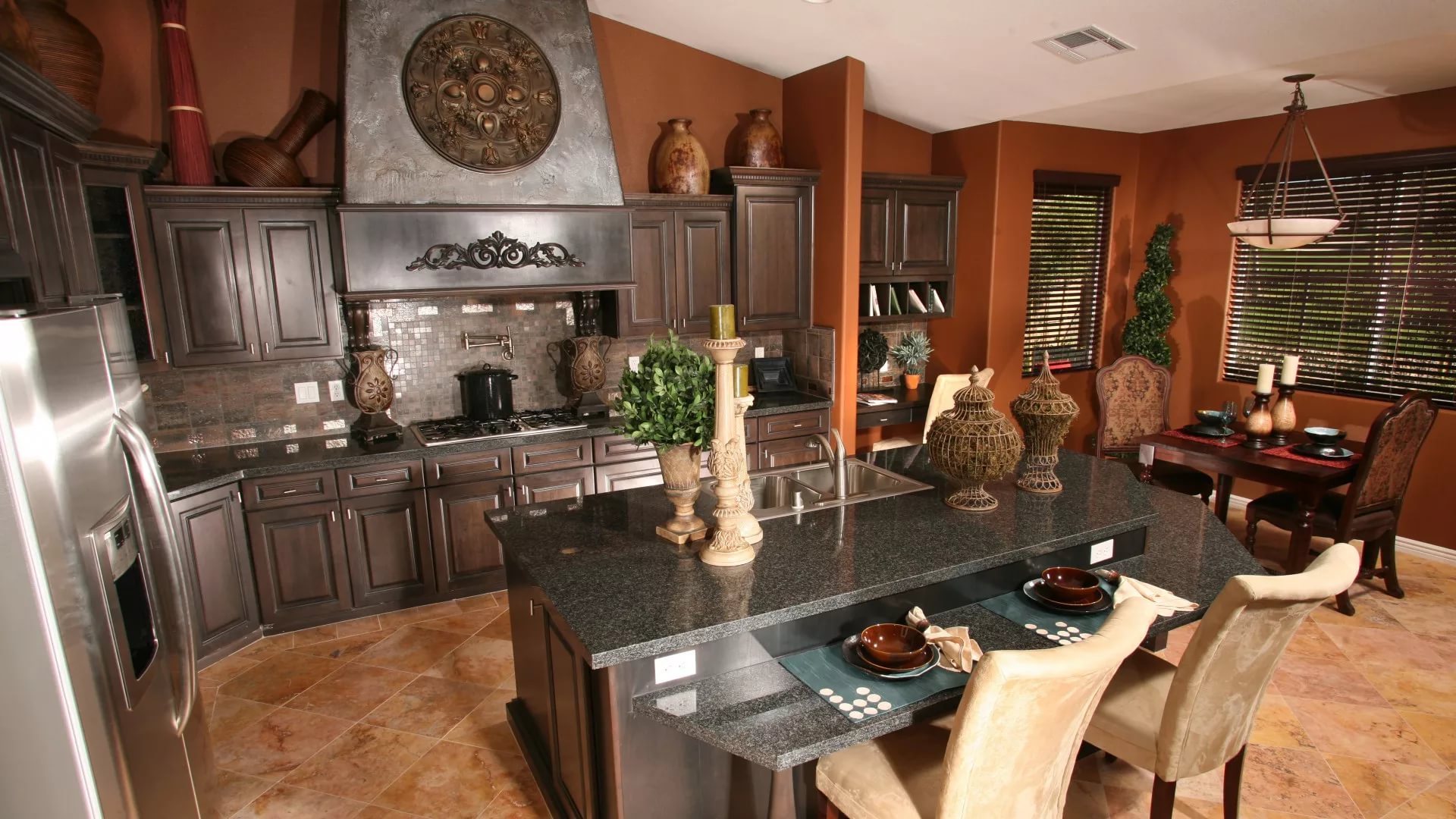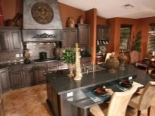 - On trouve rarement des couleurs chocolat saturées dans la conception des murs de la cuisine.Ils ont généralement un ton modéré et ne sont le plus souvent présents que sur une zone du mur. Pour ce site, les modèles avec un motif qui met en valeur les couleurs qui incarnent le reste de la cuisine sont choisis.