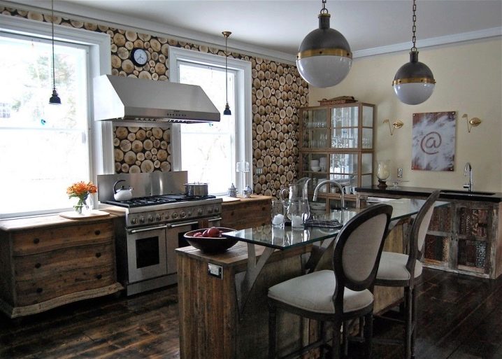 - Un motif similaire peut être présent dans le style du pays, mais, en plus du bois, vous pouvez souvent trouver du papier peint qui imite la maçonnerie en bois. Afin de souligner la particularité du style, les murs sont également décorés d'accessoires en forme de têtes d'animaux.