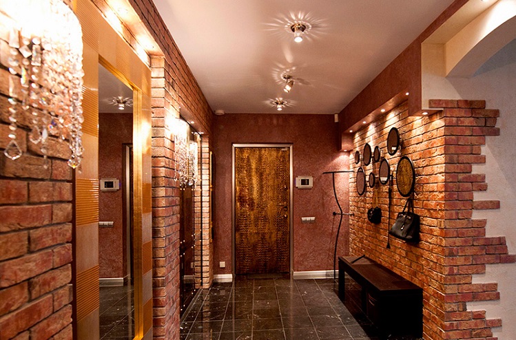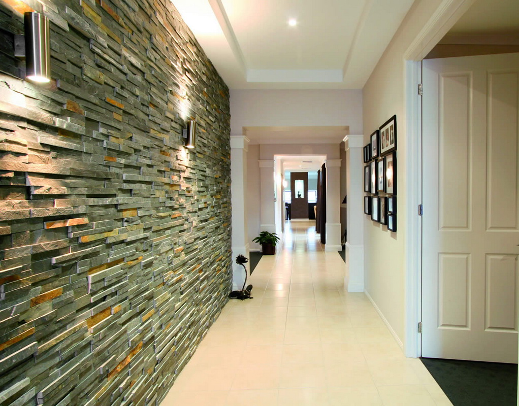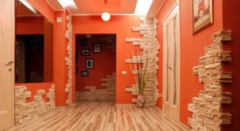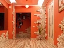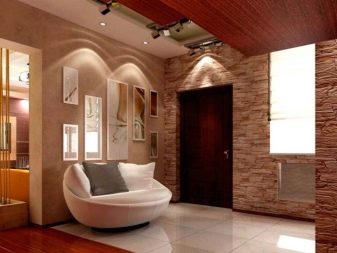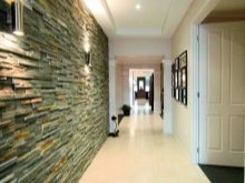 - Où dans l'appartement se trouve l'intérieur le plus simple et le plus concis? Peut-être est-ce un couloir ou une salle menant au logement principal. Le plus souvent, il n'y a pas de fenêtres dans les couloirs, de sorte que cette pièce semble parfois sombre et étroite. Pour la décoration de tels espaces, des papiers peints monochromes en pierre de couleur claire avec dépoussiérage de grès ou de quartz sont appropriés, et autour des portes, vous pouvez coller des carreaux imitant des pierres. Grâce à ces solutions audacieuses, même un intérieur élégant se transformera en un bâtiment moderne et élégant.
