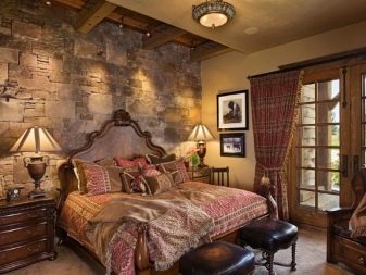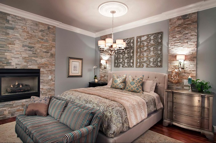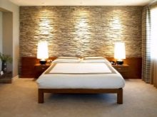 - Même si du papier peint ordinaire avec un motif est collé dans votre chambre à coucher, ce n’est pas une raison pour abandonner les inserts en pierre: ils peuvent mettre en valeur un espace séparé (corniches et niches), décorer l’espace de chevet. Une excellente option pour combiner le papier peint en plâtre sous des murs en pierre et en plâtre est la conception de leurs portes qui donnera à votre maison une saveur particulière.