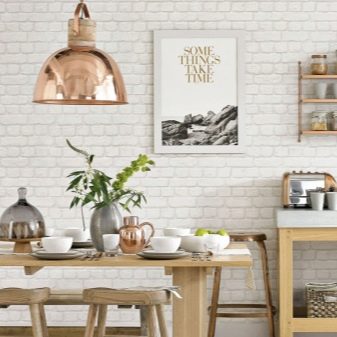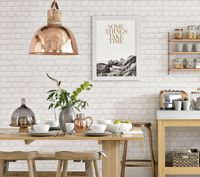 - Les papiers peints de type brique ont fière allure dans la cuisine et peuvent remplacer un tablier en tuiles et séparer la salle à manger de la zone de cuisson.