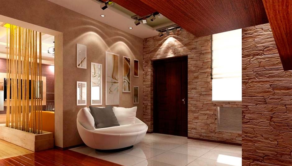Par exemple, si vous avez besoin d'un zonage d'espace, mais que l'espace n'est pas trop grand, vous pouvez utiliser une combinaison de papier peint uni ou de murs en plâtre et une décoration en pierre de la même couleur.Cette combinaison ne réduit pas visuellement la pièce.