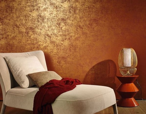 Les papiers peints enduits de grès ou de quartz sont extrêmement sensibles au contre-jour.La lumière joue sur tous les visages, se reflète efficacement dans les courbures de la toile de pierre. Il est particulièrement nécessaire d’éclairer les intérieurs particulièrement chics, car la lumière se reflètera non seulement sur les facettes de la pierre, mais aussi sur la dorure des cadres, des éléments de décoration pour le mobilier et des pendentifs en cristal de lampes.