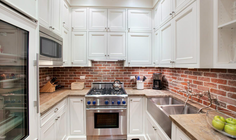 - Le tablier de protection imitant une pierre ou une brique, si nécessaire dans la cuisine, a fière allure, cette idée est une alternative incontestable au carrelage traditionnel. Vous pouvez également utiliser du papier peint à base de brique ou avec un revêtement pour tous les murs de la cuisine, en particulier si votre cuisine est conçue dans un style loft.