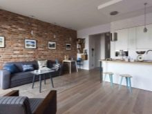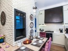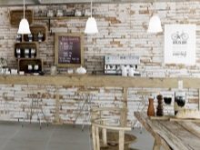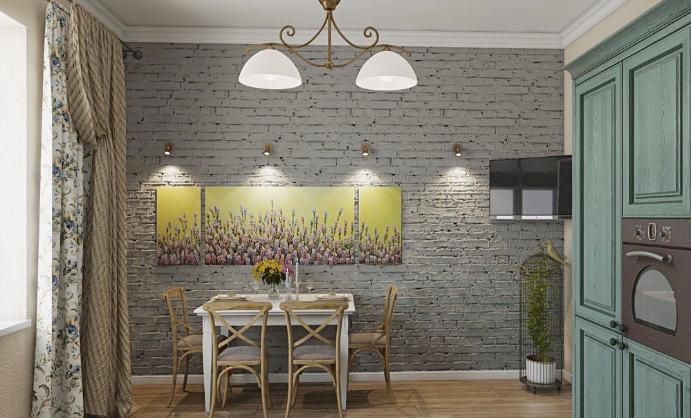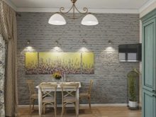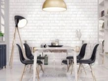 À l'aide d'un papier peint texturé imitant la brique vieillie, un mur d'accent ou une zone fonctionnelle est formé. Par exemple, dans la version combinée de la cuisine-salon, le zonage est ainsi mis en évidence, mettant en évidence la salle à manger.