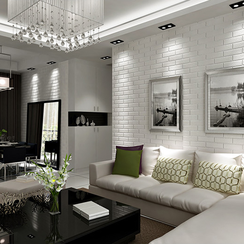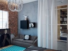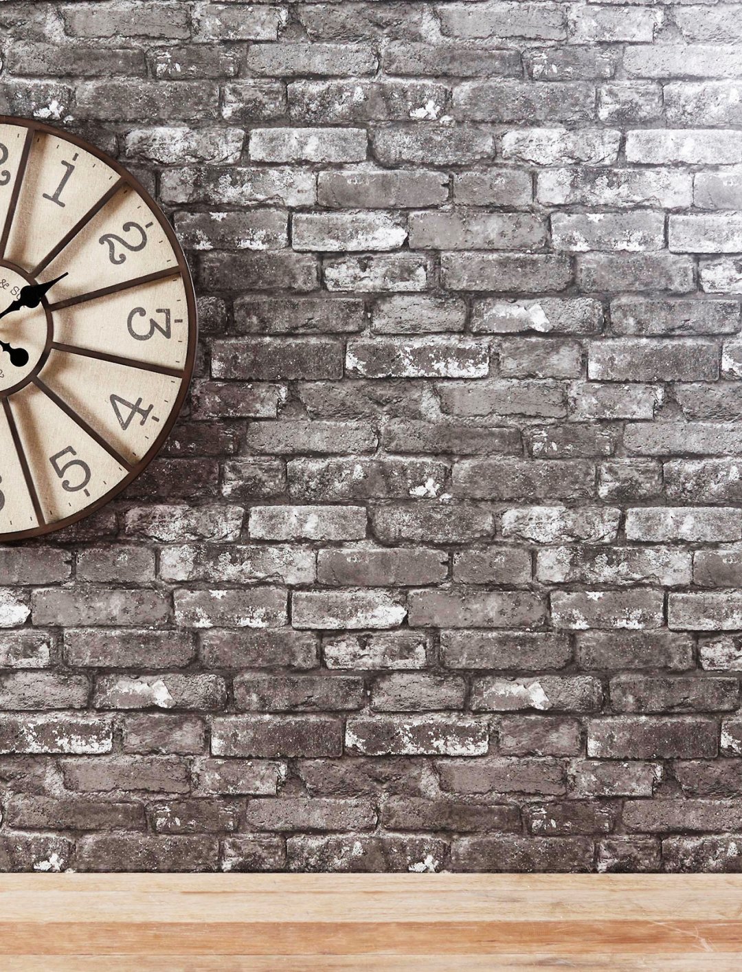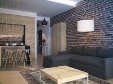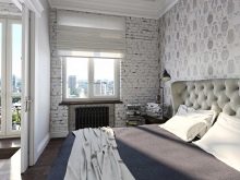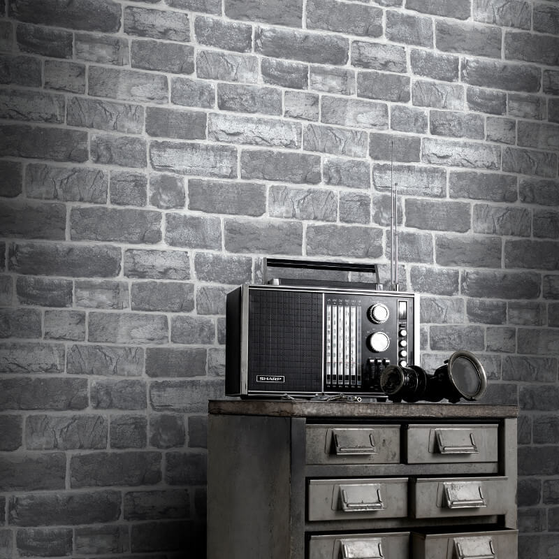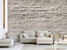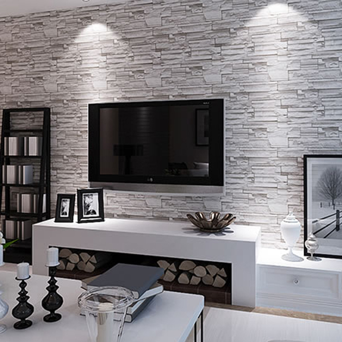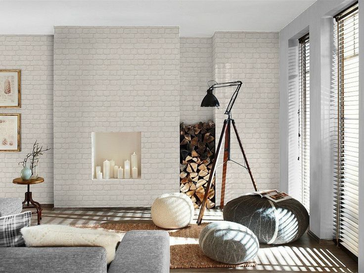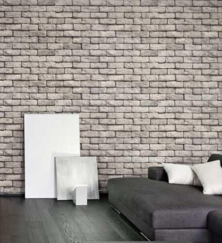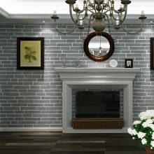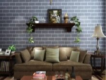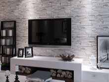 - Les murs décorés avec du papier peint imitant des briques grises serviront de toile de fond idéale pour les grands meubles, un grand panneau à plasma et un décor en trois dimensions. La palette de nuances de gris neutre crée une illusion d’espace libre.