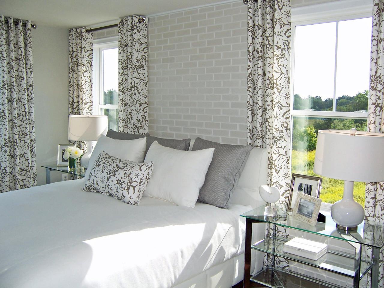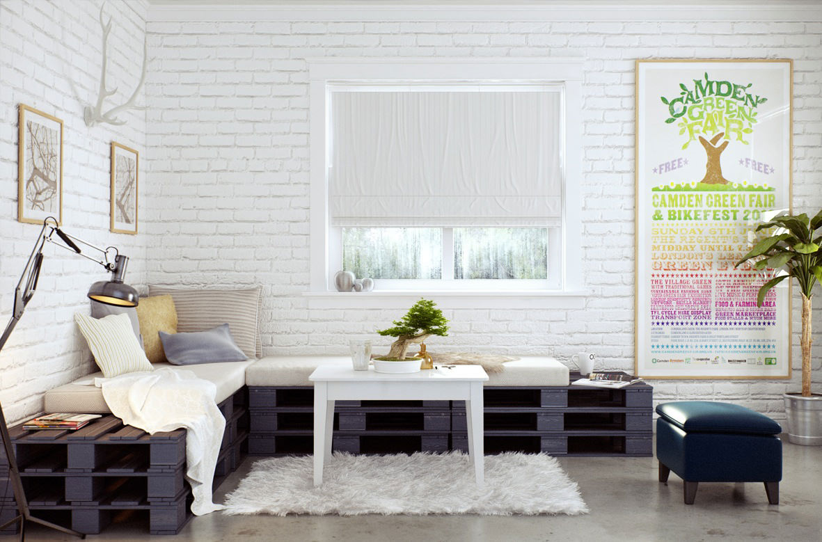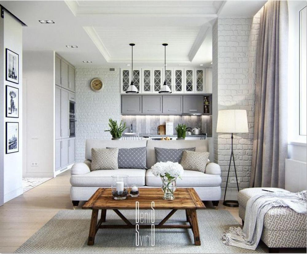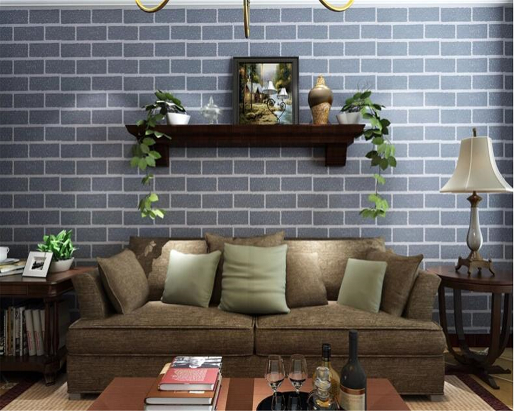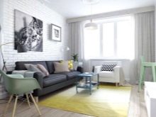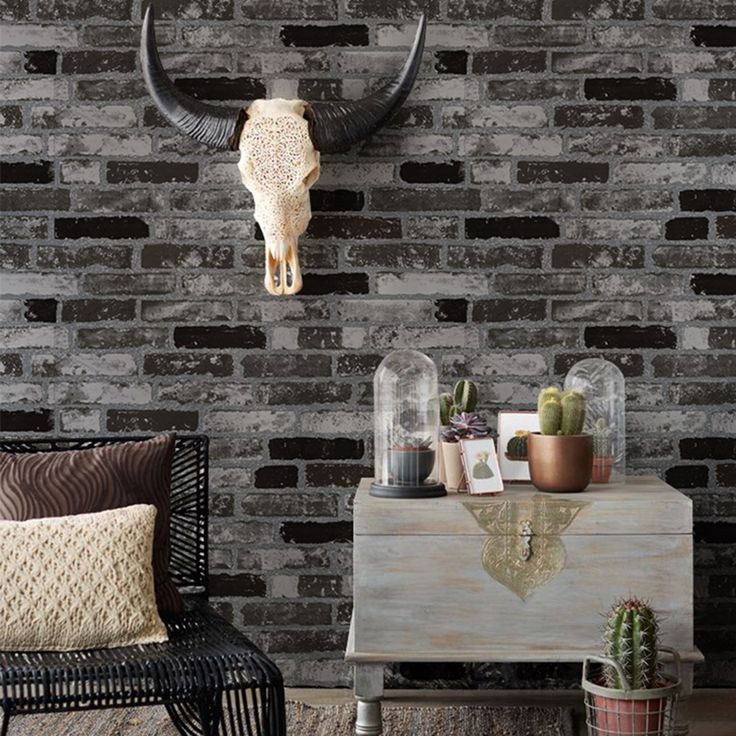 - Les murs décorés avec du papier peint imitant des briques grises serviront de toile de fond idéale pour les grands meubles, un grand panneau à plasma et un décor en trois dimensions. La palette de nuances de gris neutre crée une illusion d’espace libre.