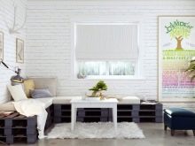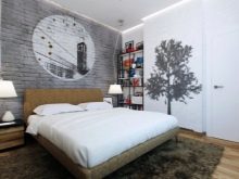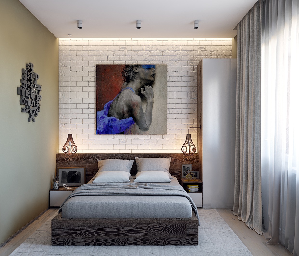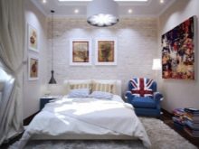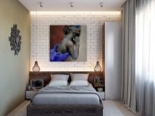 Des solutions de design lumineuses incitent à décorer toute la pièce avec des toiles. Regardez-les donc de manière fraîche, originale et crédible, ainsi que des intrigues de briques, des collages avec des photos, des timbres, des partitions. La meilleure option consiste à acheter du papier peint uni de cette marque et à l’associer à un revêtement mural en briques texturées.