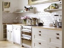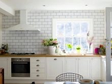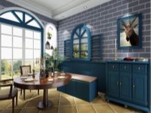 - Cuisine. Ici se concentre sur le tablier. Pour battre de manière intéressante la surface de travail, le papier peint texturé est utilisé,peintures avec un jeu de couleurs inhabituel, combinant plusieurs tons ou au contraire contrastés ou avec des briques de forme et de taille inhabituelles. De même, vous pouvez sélectionner le bar ou décorer la salle à manger.