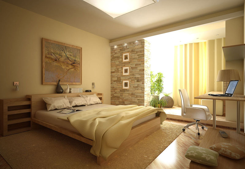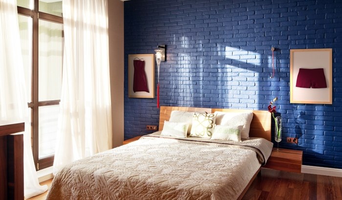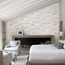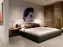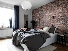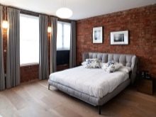 - Chambre à coucher. La brique du mur d’accentement situé à la tête du lit demande une chambre à coucher, dont le design est maintenu dans les tendances du minimalisme ou du style loft. La combinaison de tels revêtements avec un décor en verre ou en métal vous permet de devenir propriétaire du techno-design ultramoderne.
