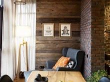 - Avec un arbre, l’association de la texture du bois et de la maçonnerie est devenue un classique de l’intérieur. Un exemple frappant d'un tel tandem est constitué de panneaux muraux en bois et d'un mur en briques crues.