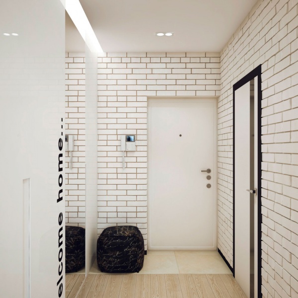 - Espace utilitaire. Dans de rares cas, les zones d’entrée et les couloirs d’appartements typiques peuvent se vanter d’une grande taille et d’un éclairage suffisant. Coller du papier peint blanc avec une impression en brique repoussera illusoirement les limites d'un espace étroit. Si vous utilisez des revêtements en combinaison avec des miroirs, l'effet visuel sera maximal.