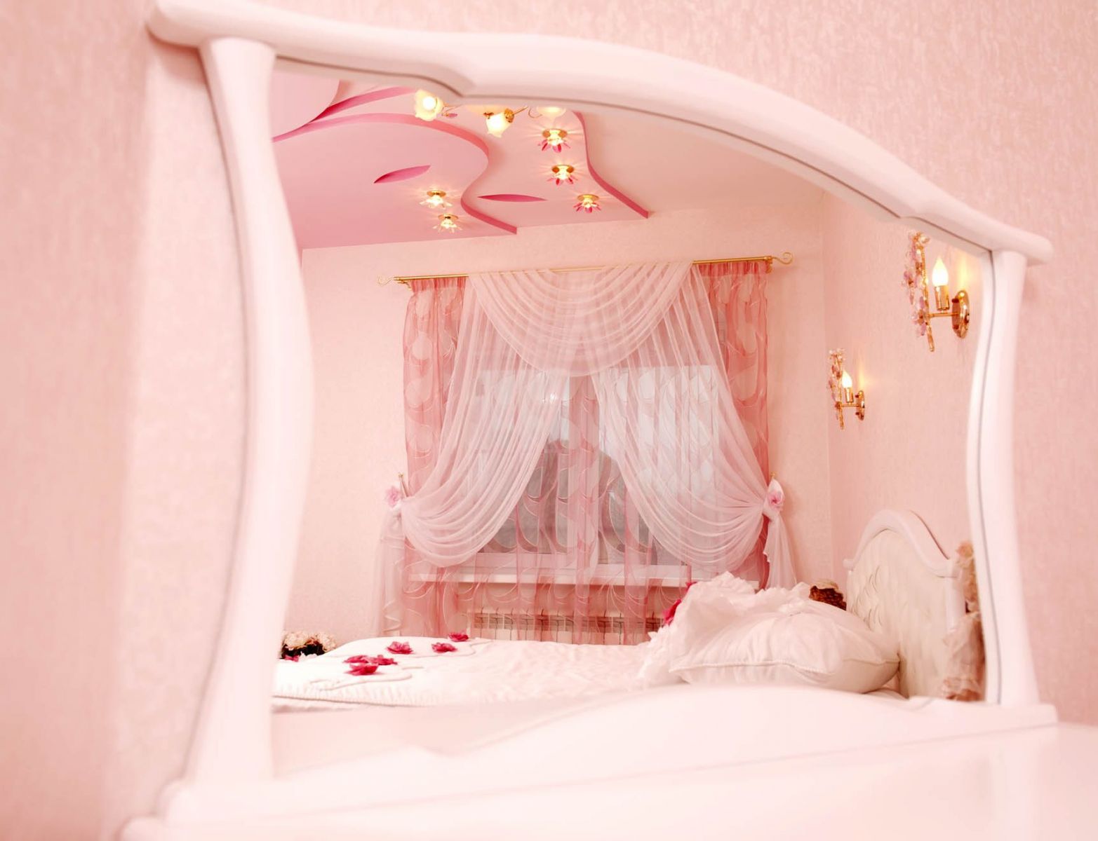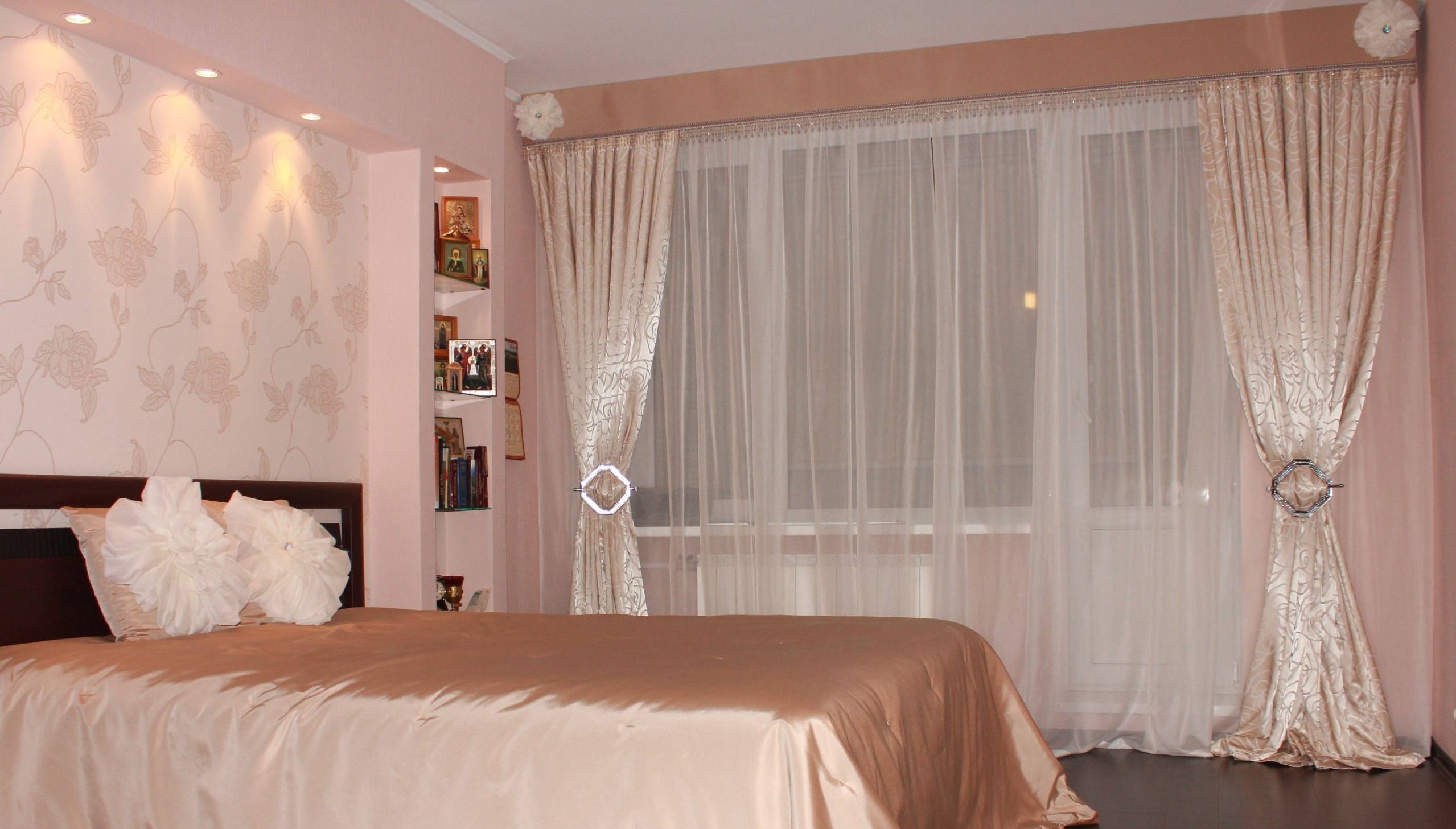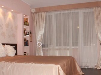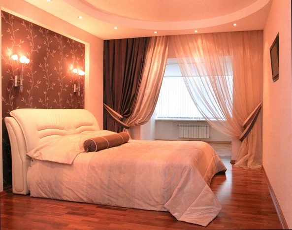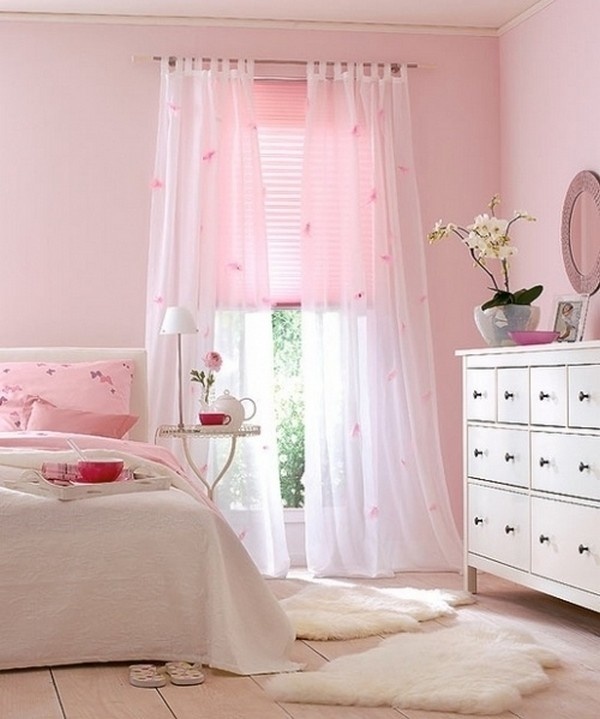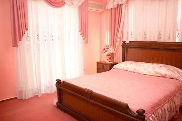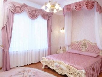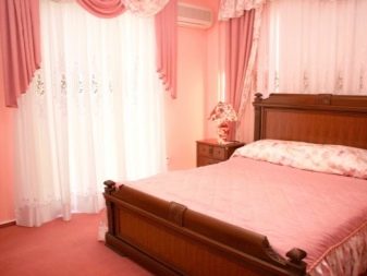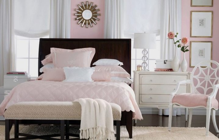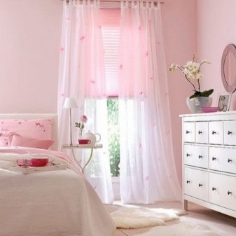 Les rideaux blancs et les murs rose pâle sont une excellente combinaison qui vous permet de masquer certaines imperfections et de révéler les avantages. Il est possible de prendre des combinaisons dans la tonalité. Dans une telle pièce, les couleurs pâles des meubles s’adaptent. Les tables de nuit brunes seront le chemin, et un tapis lilas peut ajouter un accent brillant.