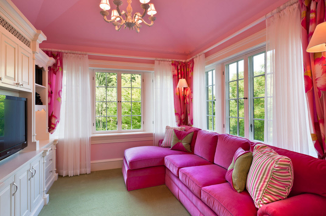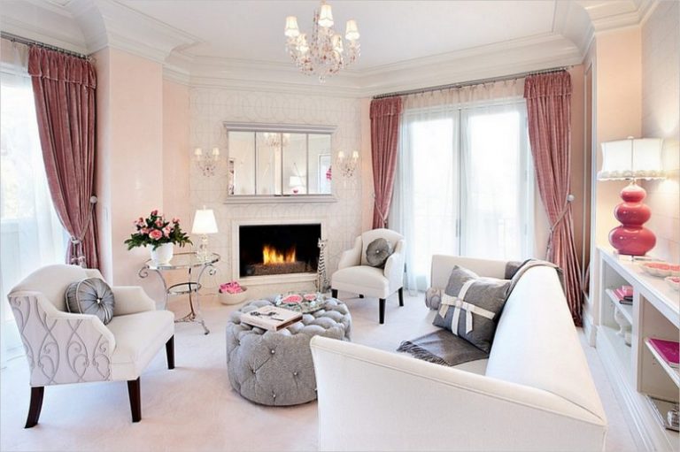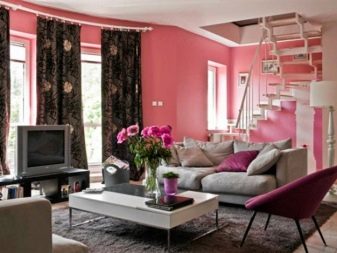 Dans le salon, classique ou néoclassique est souvent utilisé lorsqu'il s'agit du schéma de couleur rose.C'est une excellente nuance pour les yeux, raffinée et agréable, si vous la choisissez correctement.