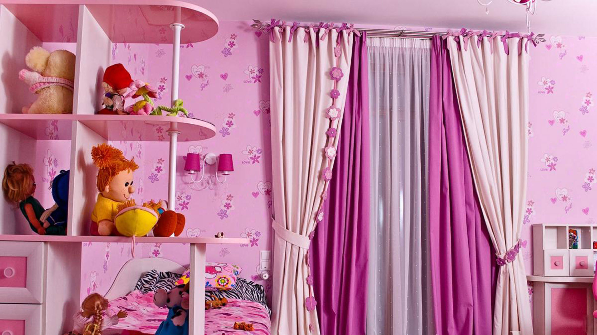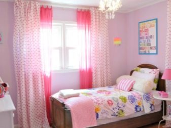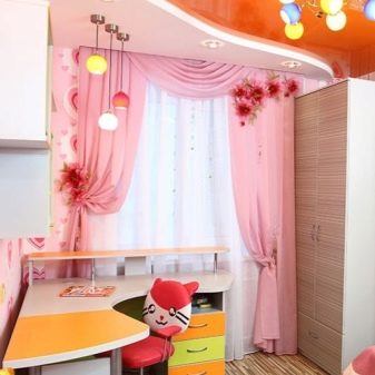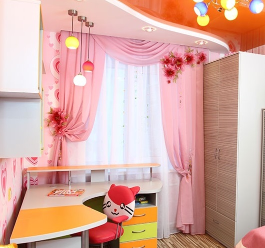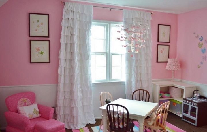 La chambre d’une fille est souvent faite en rose, quels que soient les paramètres de la pièce. Les rideaux blancs sont une excellente option pour compléter le design avec quelque chose de léger et d'apesanteur, afin que les enfants puissent acquérir une atmosphère fabuleuse et une atmosphère unique.