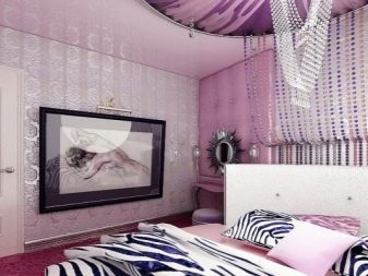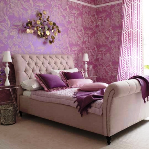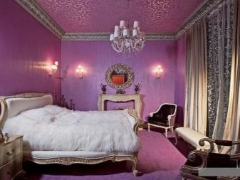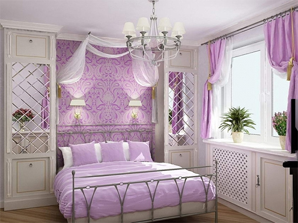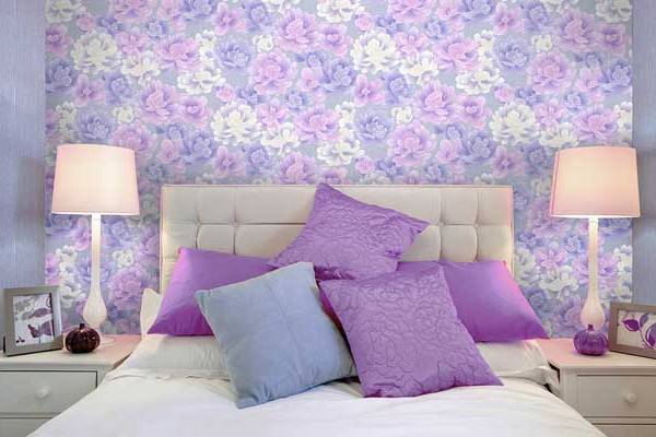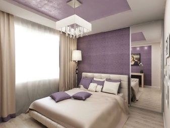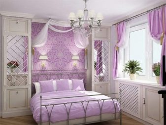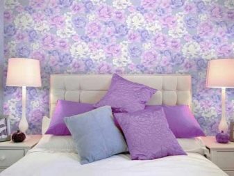 Pour la chambre à coucher, il est préférable de choisir des tons de lilas calmes et ternes avec un motif discret. Ceux-ci peuvent être des fleurs, des cercles ou des abstractions. Il est important de rappeler que les mêmes images auront une apparence différente, en fonction du style de la pièce. Les petites fleurs iront à la chambre dans le style provençal, boho, chebbi-chic.