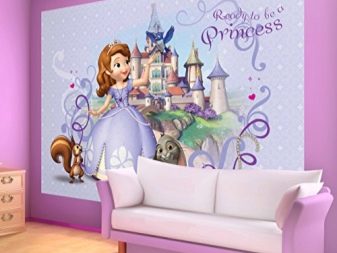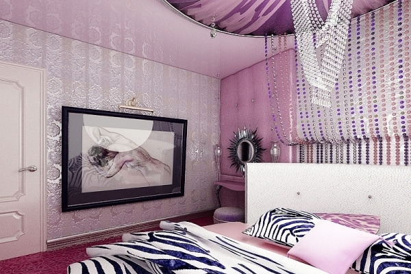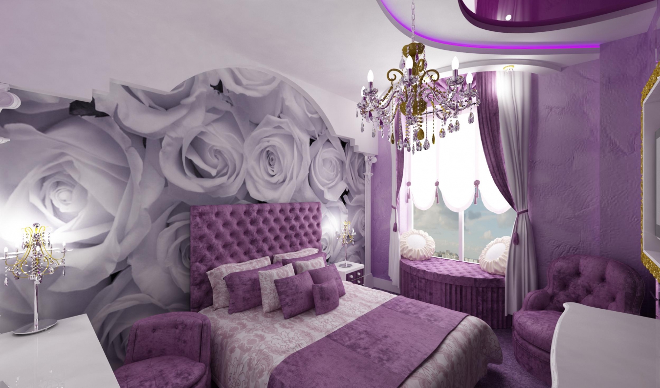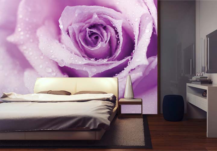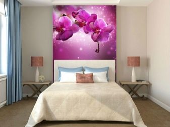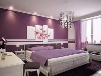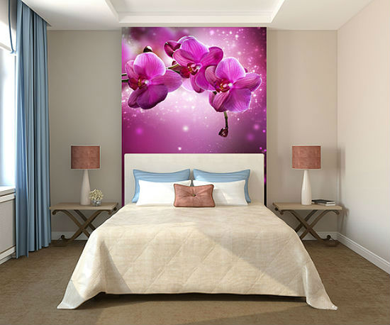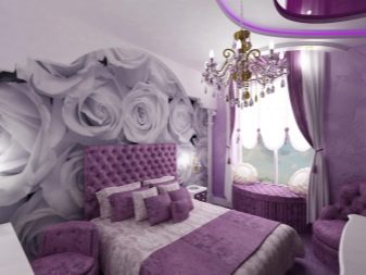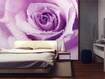 La chambre donnera des images intéressantes de roses, d’iris, d’orchidées, de sakura, de lavande et de divers paysages. En règle générale, il est conseillé aux concepteurs de choisir une photo du coucher de soleil dans des tons roses et violets, ce qui serait la meilleure combinaison avec des murs lilas.