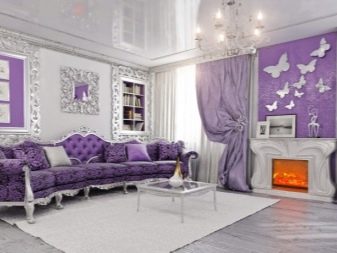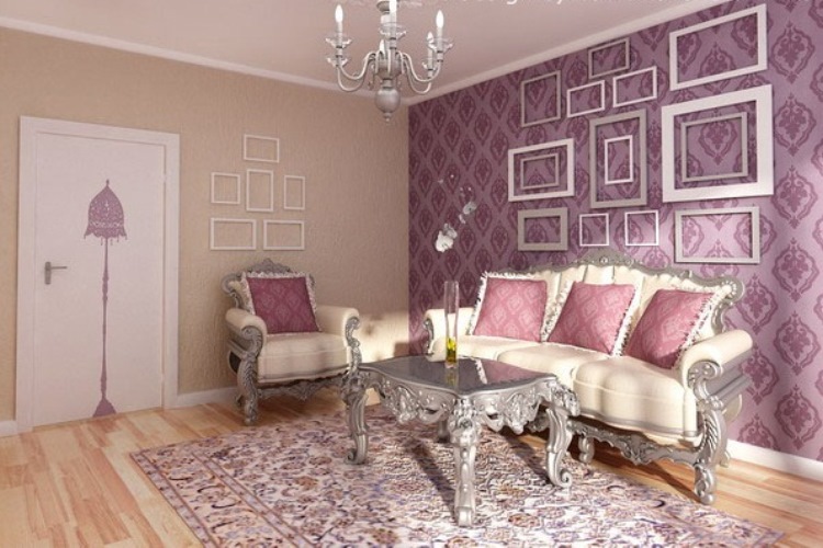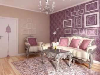 Si vous décorez le salon selon l’un des styles classiques - Renaissance, baroque ou rococo, privilégiez le papier peint lilas avec des monogrammes. Ils s'intégreront parfaitement dans le style du palais, donnant à la grâce et à la noblesse intérieures.