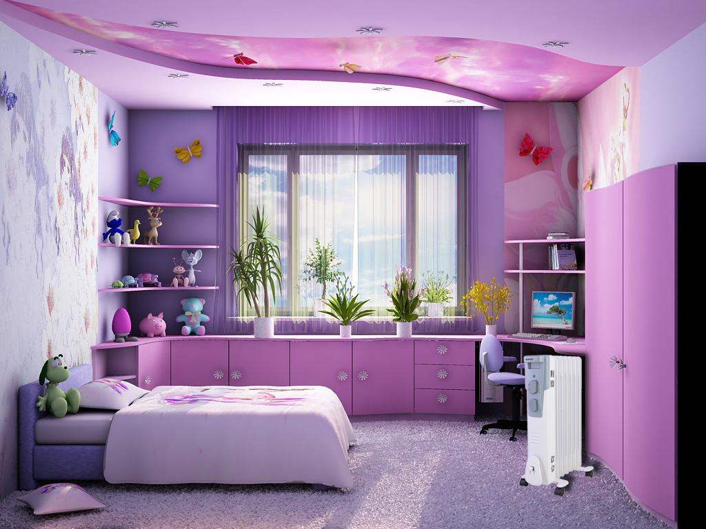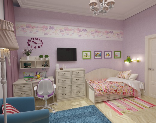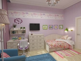 Traditionnellement, le lilas est choisi pour la chambre de la fille, très rarement il peut être présent dans la chambre du garçon. Par conséquent, le choix des dessins est également très prévisible - motifs floraux, papillons, étoiles.