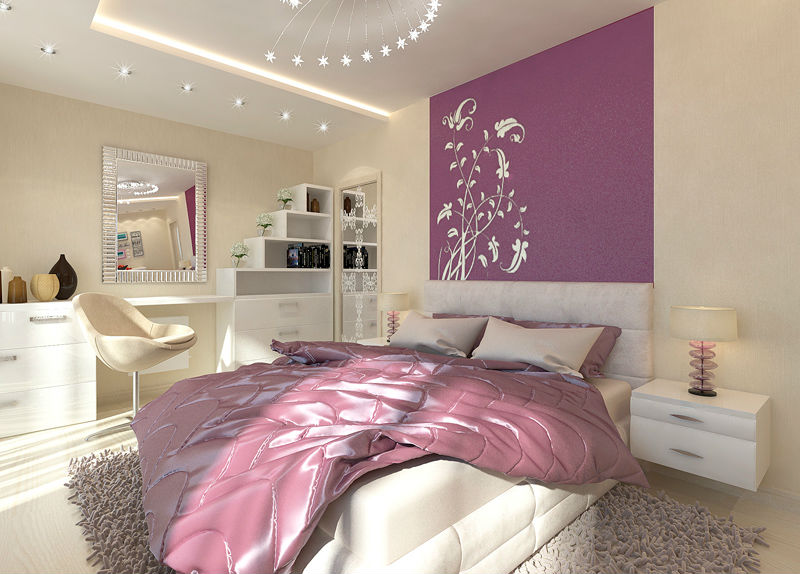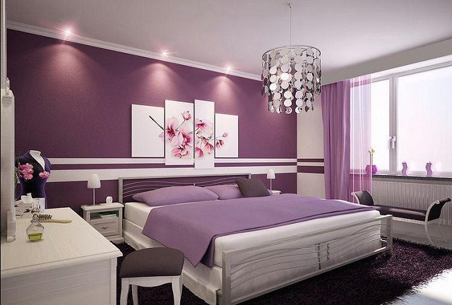 Si la chambre à coucher est décorée dans un style moderne, il est préférable de choisir une géométrie stricte, voire d’abandonner le tableau. Les papiers peints photo sont à nouveau à la mode, ils auront fière allure dans n'importe quelle pièce, l'important est de choisir le bon motif. Il est préférable qu'ils soient décorés avec un mur d'accentet les murs restants resteront monotones, dans une des nuances de lilas que vous avez choisies.