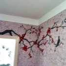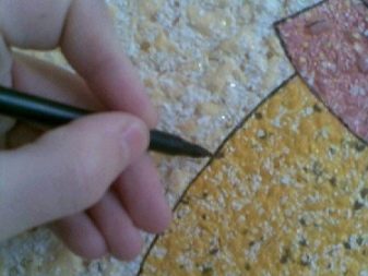 - Pour réaliser des dessins avec du papier peint liquide, il est important de noter qu’ils sont appliqués sur un fond sec ou sur des fragments séparés (et non adjacents) du motif, sinon il ne sera pas possible d’obtenir une ligne expressive plate;