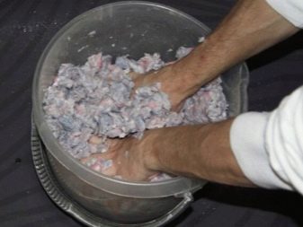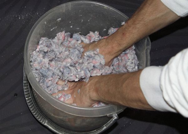 - après avoir uniformisé le matériau, on y ajoute de l’eau chaude et on le malaxe (il est impossible d’utiliser un mélangeur même à une vitesse minimale: vous pouvez ainsi écraser les fibres longues qui le renforcent);