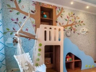 En utilisant un thème végétal stylisé, vous pouvez équiper le coin de jeu de la chambre des enfants: vous pouvez faire des dessins sur un plan uni, en mettant en valeur un petit présentoir avec des étagères en forme de tronc d’arbre brun.