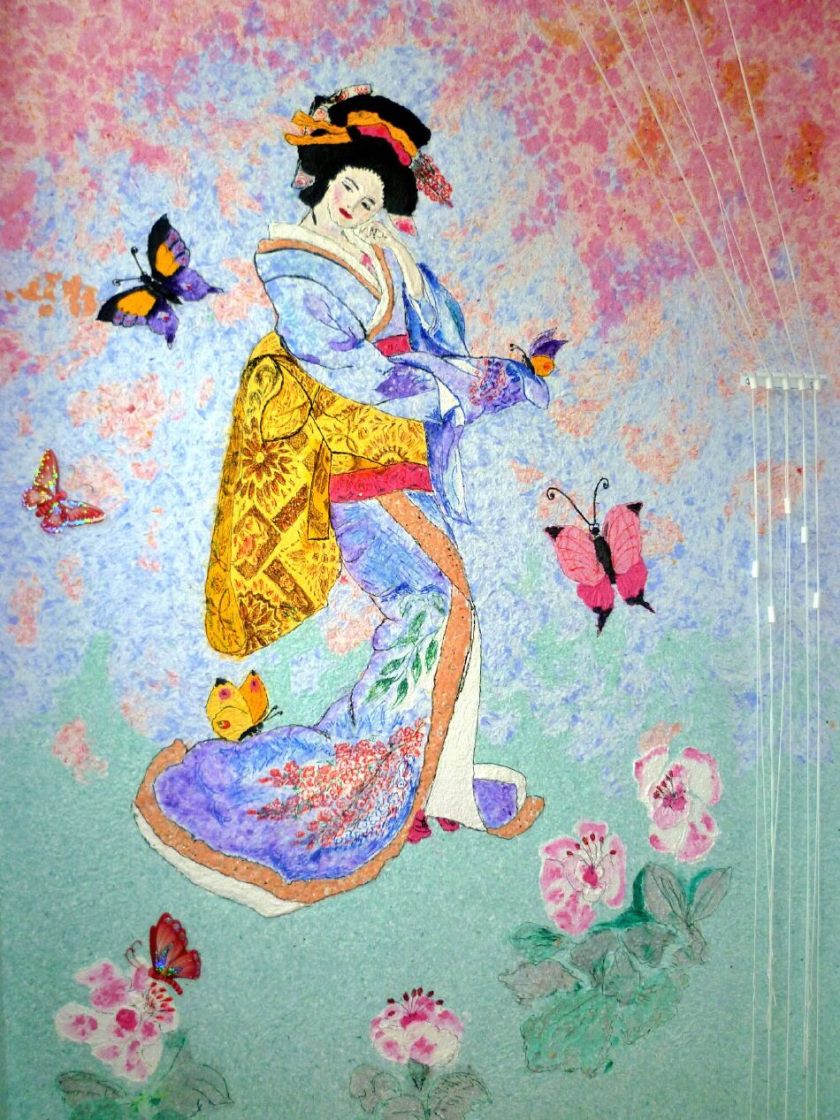 En utilisant des thèmes asiatiques et des compétences en dessin professionnelles, vous pouvez décorer l'un des murs avec un motif de geisha unique, créant ainsi des transitions de couleurs douces autour du motif et ajoutant des papillons flottants à l'arrière-plan.