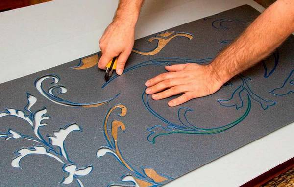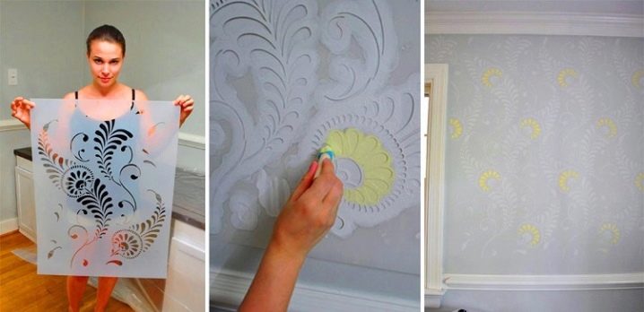 Les gabarits sont utilisés de deux manières: vous pouvez imposer des modèles prêts à l'emploi directement sur le mur fini, en réalisant un ornement particulier, en délimitant la surface ou en donnant un motif chaotique. Dans la deuxième méthode, les pochoirs sont utilisés au moment de la distribution à la surface.