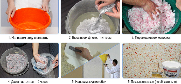 Dans le second cas, vous pouvez ajouter le reste des matières premières aux nouvelles parties du second mur. Pour des raisons pratiques, il est préférable de faire une petite quantité de papier peint liquide: c'est encore mieux s'il reste des résidus après la finition. Si, à l’avenir, il est nécessaire de corriger le problème, il sera possible d’utiliser des matières premières prêtes à l'emploi, de nuance et de texture similaires.