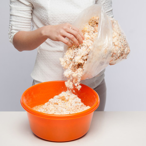 - après avoir trempé la masse dans de l'eau, elle est placée dans un sac, hermétiquement fermé, et laissée au repos pendant une durée indiquée sur l'emballage (généralement entre 6 et 12 heures): la colle doit ramollir et lier les fibres.