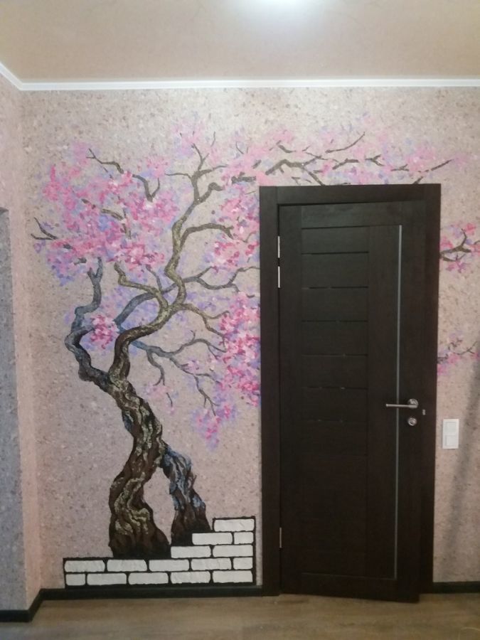 Une décoration murale douce et élégante ressemble à du papier peint avec un motif d’arbres de sakura: des arbres bruns avec des pétales roses se détachent contre le mur gris tout en étant soutenus par le ton des portes et du passage.