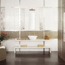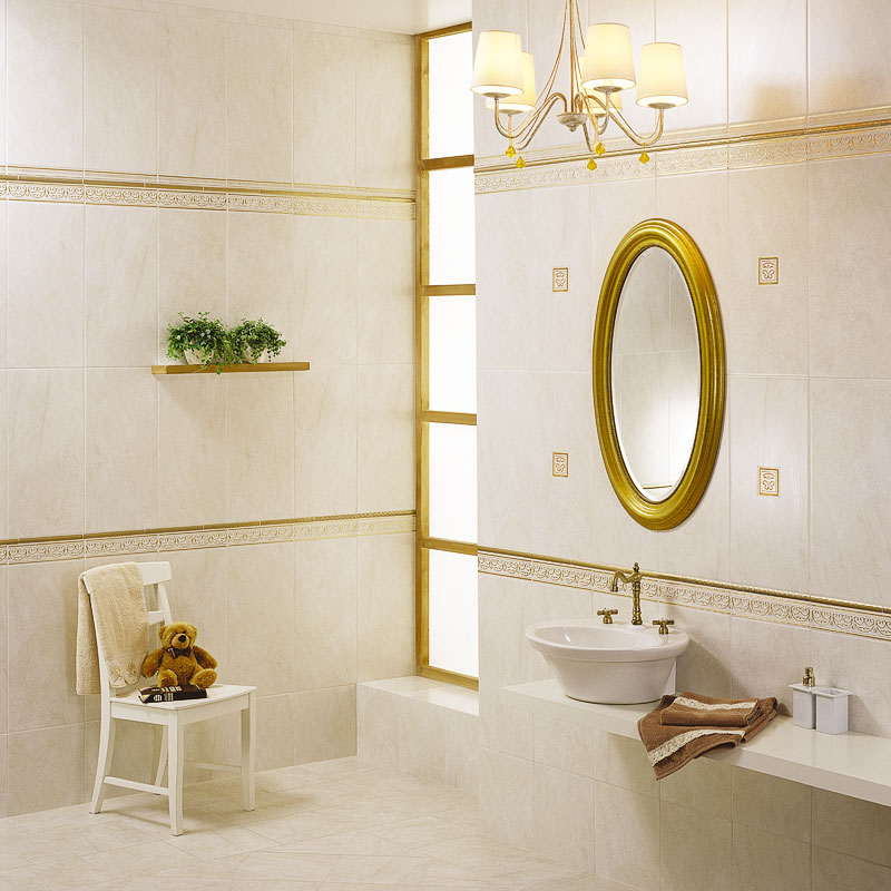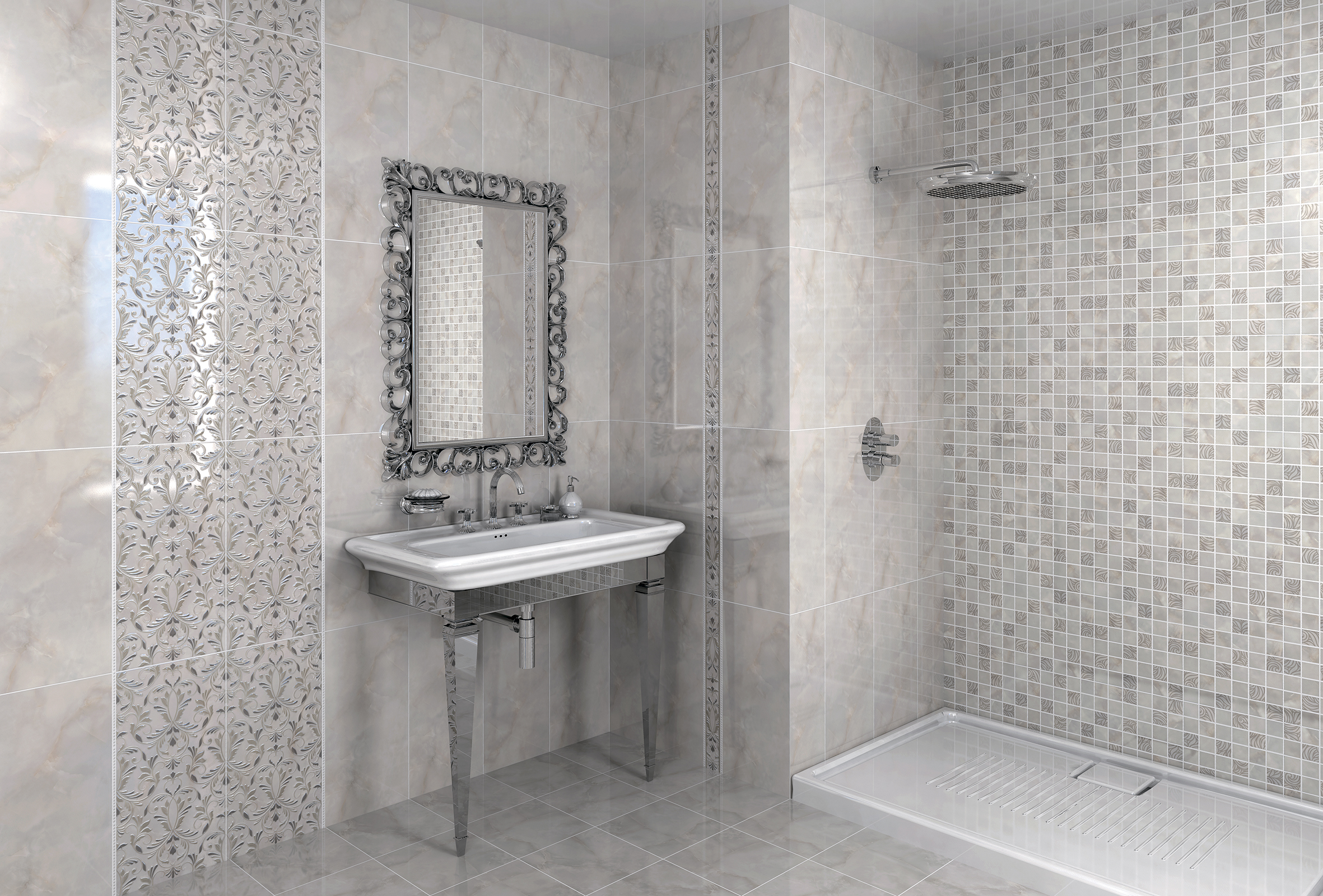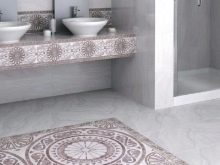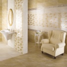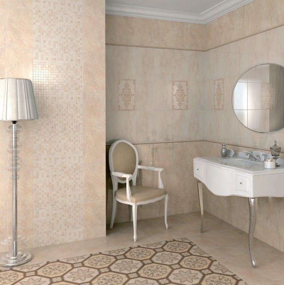 Pour la décoration de la salle de bains utilisé une série de "Virgiliano". Le carrelage reflète parfaitement la texture du marbre naturel et possède également une surface brillante. La tuile est faite en beige et gris.Les éléments les plus marquants de l’intérieur sont des décors ornés du motif de Damas du Moyen Âge, ainsi que des ornements floraux. La richesse et le luxe sont les avantages indiscutables de cette tuile.