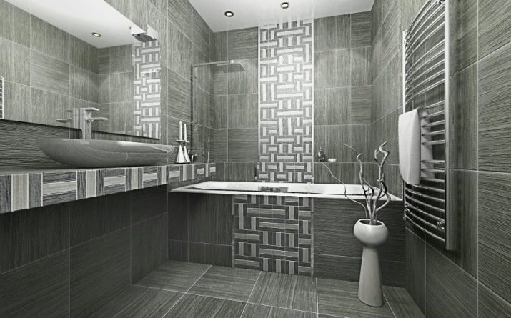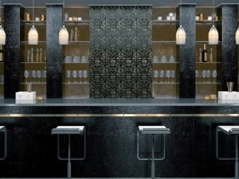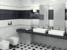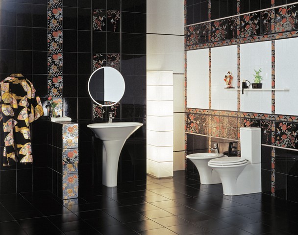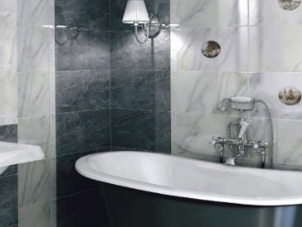 - Souvent, pour créer un revêtement de sol, beaucoup préfèrent les carreaux noirs en raison de leur élégance et de leur luxe. Si vous utilisez des céramiques noires pour décorer la salle de bain, vous devez être prudent, car non seulement cela peut rendre la pièce visuellement plus petite, mais des gouttelettes d'eau, des taches, des fissures et des irrégularités sont clairement visibles sur un tel carreau.