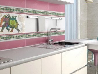 Dans la conception de la cuisine, on utilise souvent des collections lumineuses, dans lesquelles les carreaux de fond sont représentés par des carreaux roses, orange, rouges et violets.