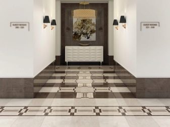 - Pour la réalisation d'une pièce intérieure stricte, le carrelage est idéal avec une surface mate. Les céramiques brillantes sont élégantes et solennelles, elles brillent et brillent sous la lumière des lampes.