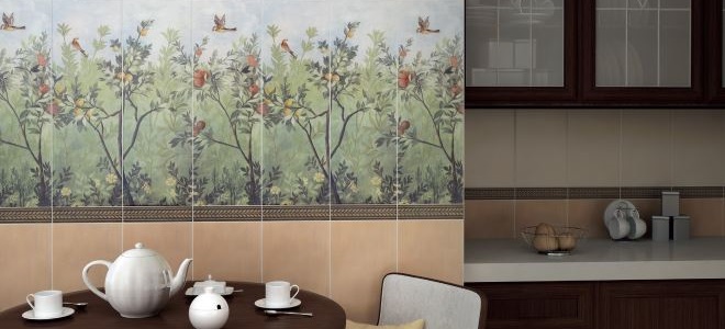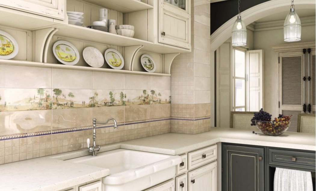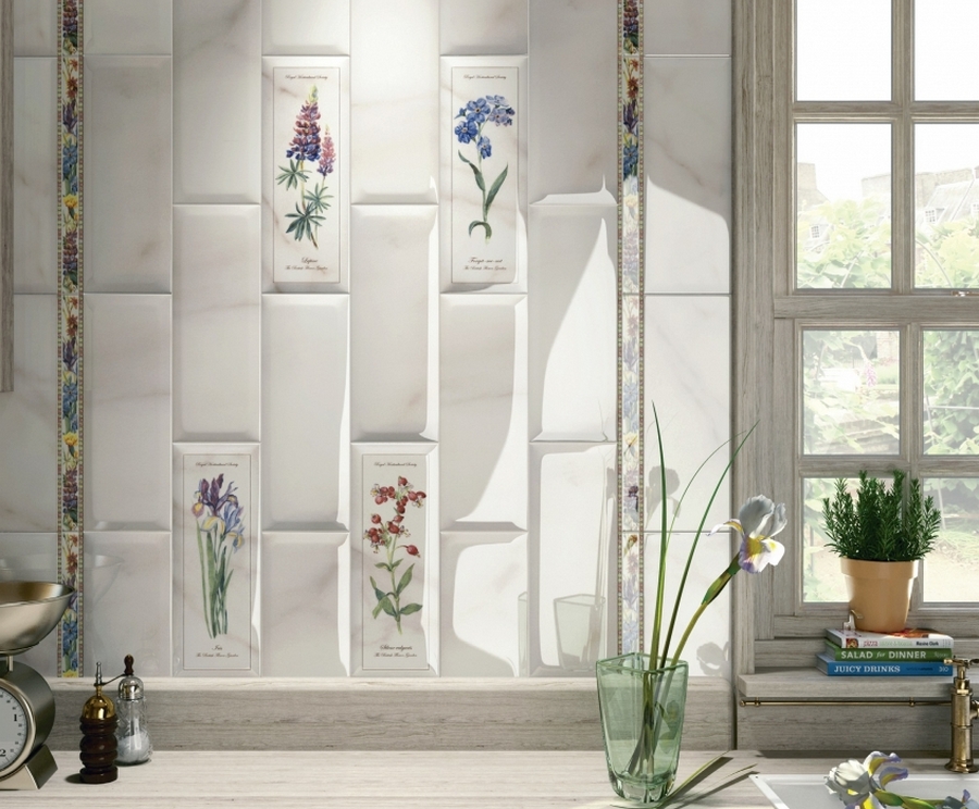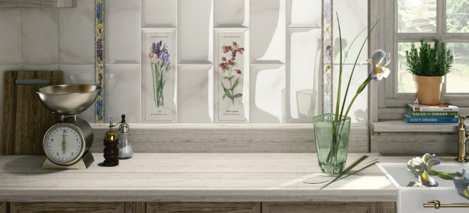 Série "Forio" - Un bon choix pour décorer la cuisine. Les céramiques sont fabriquées dans des tons doux. Les décors de la série de céramiques sont des décors sous forme de tableaux entiers. Des croquis de la côte de la mer et des peintures sur un thème floral créeront des accents lumineux à l’intérieur de la cuisine.