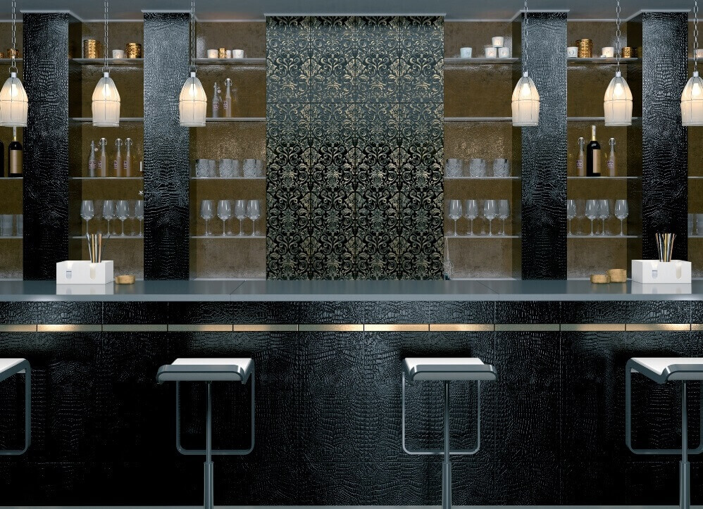 La tuile sous la peau est spectaculaire et intéressante. Il traduit très précisément la texture de ce matériau naturel. De tels carreaux peuvent contribuer au luxe, à la richesse et à la beauté de la pièce.
