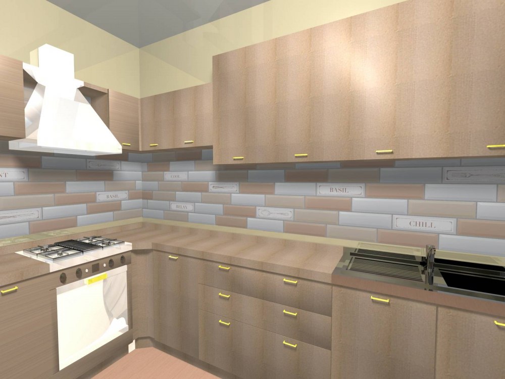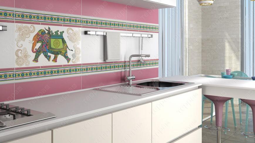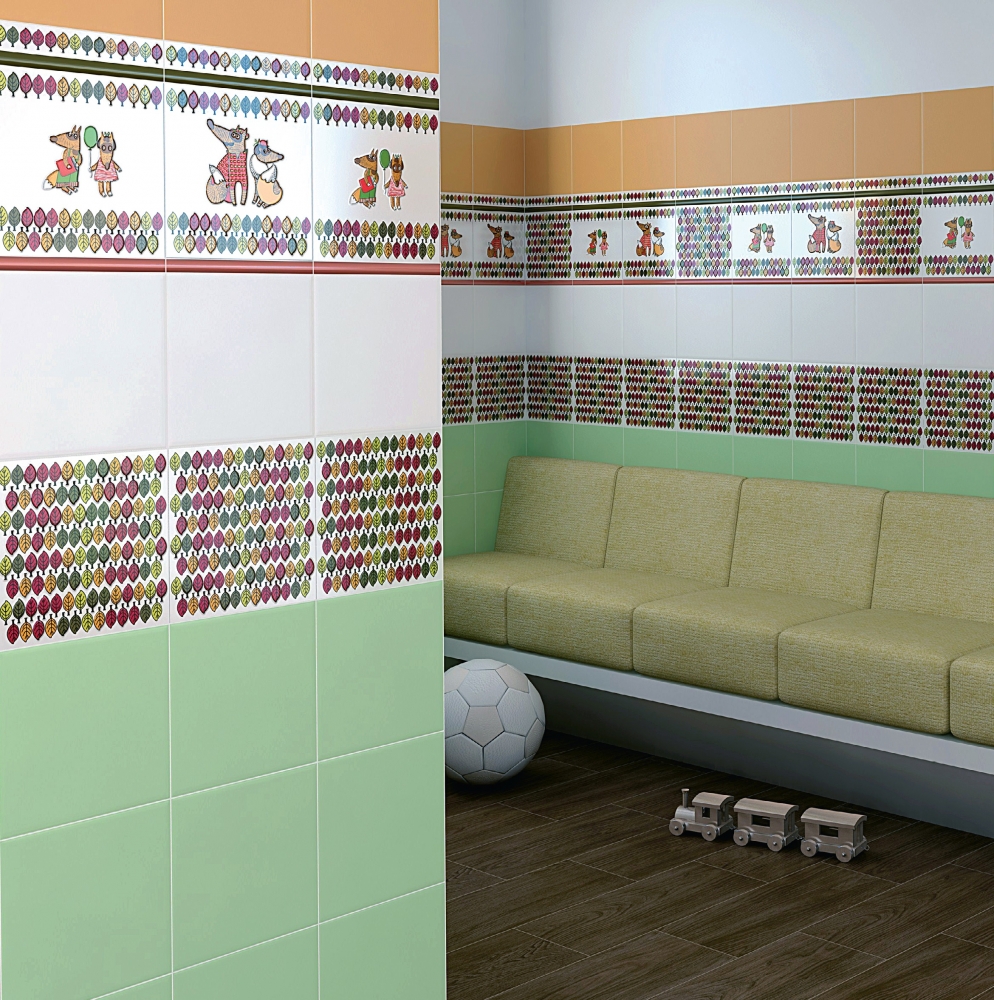 Série gamma idéal pour la conception de la cuisine, car il contient beaucoup d'éléments décoratifs, qui décrivent la coutellerie et les noms des épices. Les concepteurs recommandent l'utilisation de la pose sous la brique, car les céramiques de fond sont présentées sous la forme de "cochon". La série utilise pistache, marron, noir, noir et blanc.