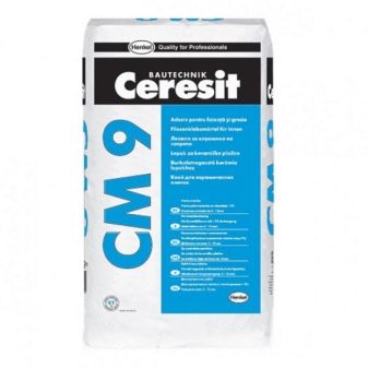 - Ceresit SM-9. La composition est considérée comme le plus faible de tous les mélanges. Il a une faible résistance au gel et n'est pas conçu pour travailler dans des locaux non chauffés et dans la rue. La colle à base de ciment est utilisée pour la pose de briques décoratives, de types de dalles de petit format et de pierres artificielles. Le temps de durcissement complet est de trois jours. L'adhésif peut supporter une trentaine de cycles de gel-dégel et est utilisé pour des fondations stables en béton et en ciment.