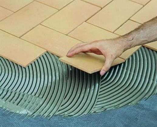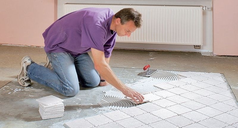 Pose de carreaux de sol avec colle pour carreaux "Kreps" renforcés.