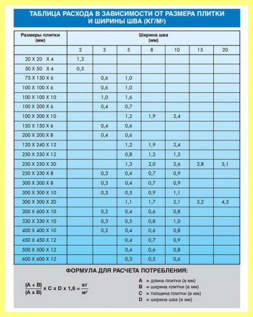 - La consommation est influencée par les caractéristiques du carreau et sa qualité d'absorption d'eau. Ainsi, le carreau émaillé absorbe la composition la plus adhésive, il est donc nécessaire d’utiliser beaucoup de colle. Mais le grès cérame, ainsi que les carreaux de terre cuite et les modèles faits main durables absorbent peu de colle, de sorte que le coût sera réduit dans ce cas.