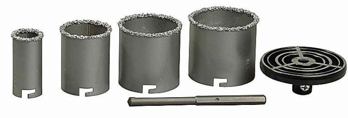 Les structures en carbure possèdent une perceuse en carbure de centrage, grâce à laquelle vous pouvez utiliser une simple perceuse électrique. Ce type de buses le plus souvent vendu dans un ensemble. Contrairement aux fraises diamantées, les options au carbure sont moins chères. Le prix dépend du diamètre: plus la taille de la couronne est grande, plus elle est chère.
