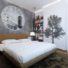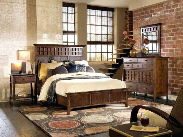 Non moins intéressante est l'inversion particulière d'une telle option: le mur peint derrière la tête de lit et les autres murs bordés de carreaux de brique. Le mobilier en bois s'intégrera de manière organique dans un design de chambre aussi non trivial: un grand lit avec de belles sculptures, un fauteuil à bascule, une table basse vintage,un coffre vieux ou artificiellement vieux qui peut être utilisé pour stocker des choses.