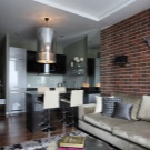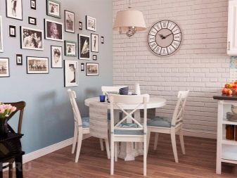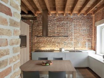 Il sera également très intéressant d'examiner l'option dans laquelle la tuile en brique est combinée à une couleur avec un rembourrage de chaises et un plateau en bois. Cela donnera à la pièce une unité composite et un sentiment de complétude.