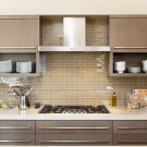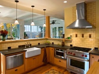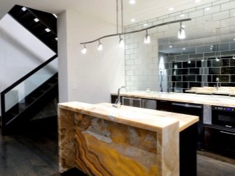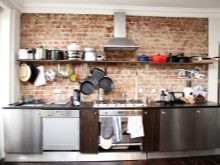 Les motifs industriels et les briques de la cuisine auront fière allure. Habituellement, les tuiles pour briques constituent la zone du tablier à côté du poêle, la zone de l'évier et la zone de travail elle-même. Il est préférable d’utiliser des carreaux, mais si les propriétaires veulent rendre la pièce unique et originale, vous pouvez faire attention aux carreaux de verre. Le verre particulièrement intéressant sera combiné aux éléments du rétroéclairagePar exemple, bande de LED. Cela fournira un éclairage supplémentaire à la zone de travail.