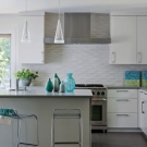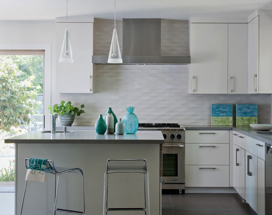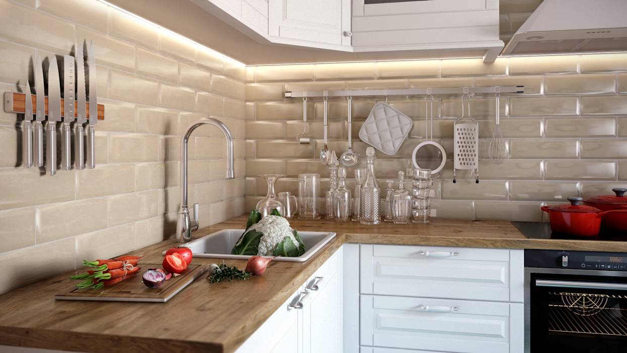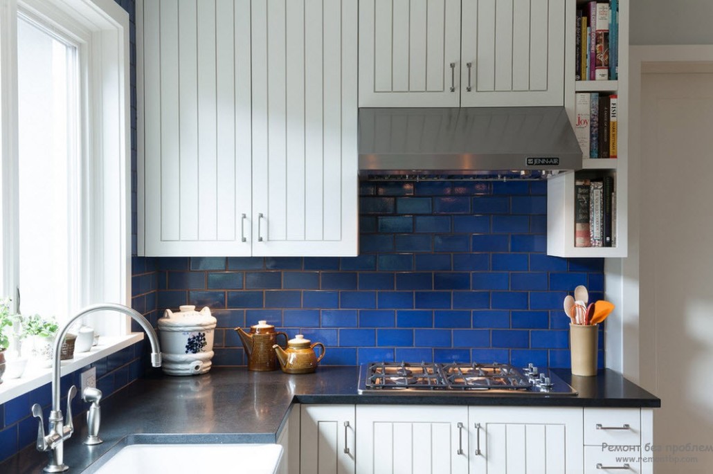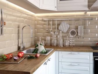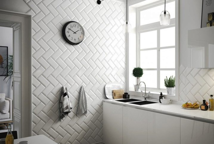 Beaucoup la tuile blanche brillante sera une option pratique: en cas de pollution inévitable dans la cuisine, son nettoyage ne sera pas difficile, même avec des détergents agressifs à base chimique. La seule chose à laquelle vous devez faire attention: les carreaux de plâtre ne sont pas recommandés.