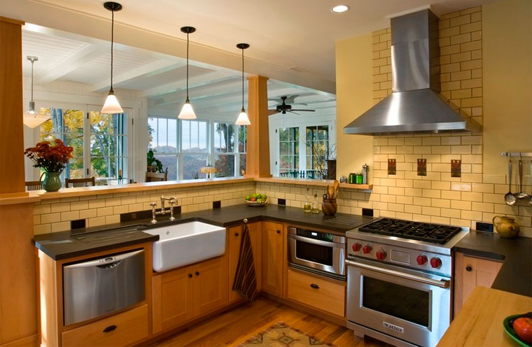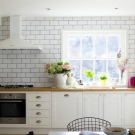 L'option la plus standard pour la cuisine - tablier de décoration en brique sur le poêle. Vous pouvez choisir un carreau blanc, ce qui donnera une sensation de propreté et d’espace, mais il faudra le nettoyer un peu plus souvent que si vous préférez des produits de couleurs moins grandes.