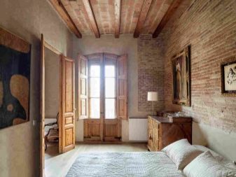 La brique se combine merveilleusement avec le bois. Les carreaux de brique brun-rouge, combinés dans une composition unique avec une décoration de plancher et de plafond en bois, auront un look très élégant et, aussi paradoxal que cela puisse paraître, modernes. De plus, ces couleurs chaudes rendront la chambre confortable.
